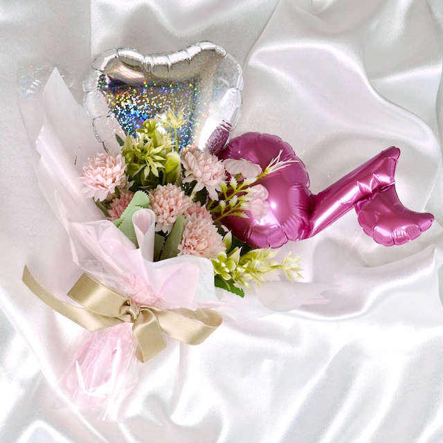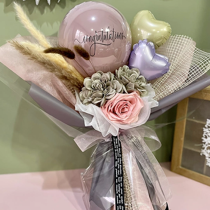 秋冬にぴったり♪猫じゃらしなどの装花があしらわれたナチュラルカラーブーケです。少しグレーがかったくすみピンクゴム風船が入った丸型透明バルーンに文字入れしております。お誕生日、卒業式、成人式など、記念日にぴったりなブーケです。